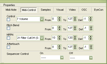 If you want to send out a MIDI control message, switch the output settings to the Midi-Control tab after checking that you selected the proper Midiport and channel on the 'Midi-Note' page. Enable the sending of control change messages by checking the check-box. Select the controller number (7 for example is the channel volume). The From and To values define how the midi control values are mapped to the parameters of the Eyecon element. The 'Def' value defines a 'Default' or 'Fallback' value, which is sent out, when the Eyecon element is not triggered anymore. A value of -1 indicates that there is no message sent at all when you leave the line or field.