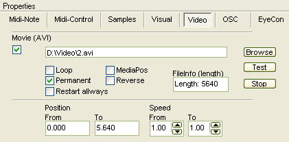 Basically everything you have to do is to browse for your video file or type it into the filename field. Different options determine, how the video is played. After loading the video file you will see a filelength info which is showing the playing time of the video clip in Milliseconds. You can setup a certain range in the clip you want to trigger with an EyeCon element. Input is in seconds. Play speed can be varied.